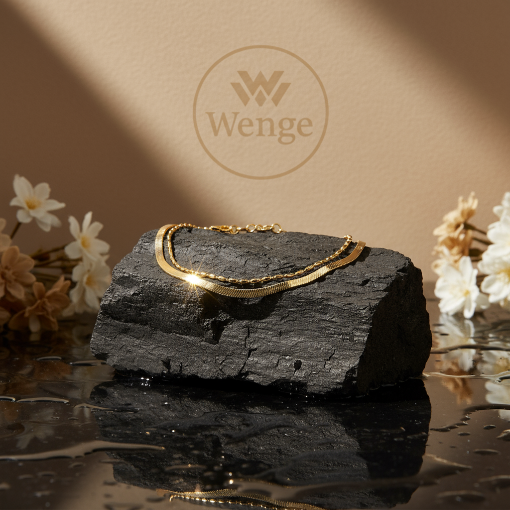 A timeless anklet from Wenge, crafted with stainless steel and 18K gold plating. Lightweight, waterproof, hypoallergenic, and tarnish-resistant, it’s perfect for everyday styling.
